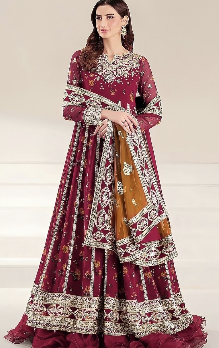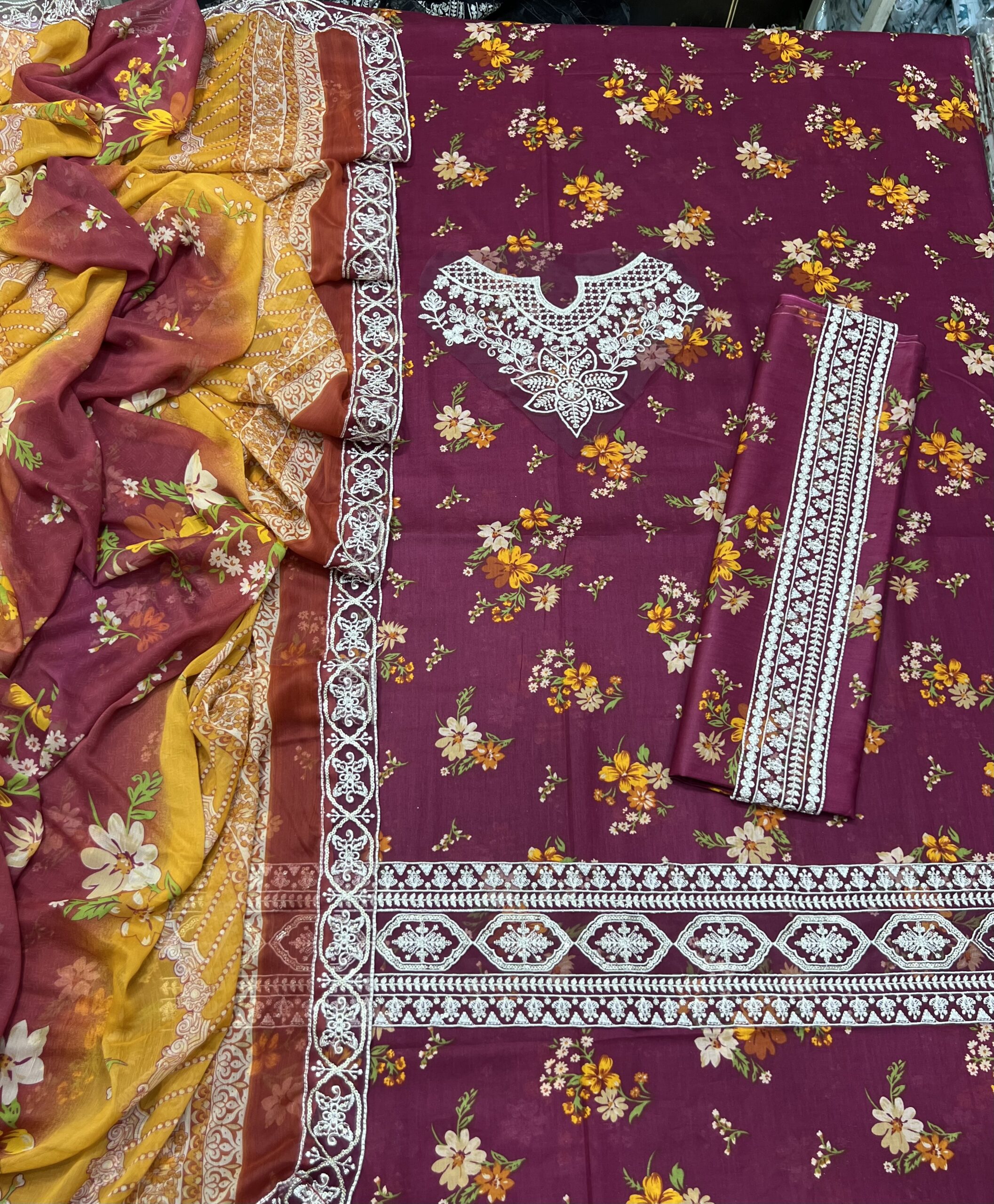 Shirt ke daman aur sleeves par bhi matching embroidered border hai jo overall look ko complete karta hai. Dupatta chiffon ka hai jisme black aur red ka beautiful combination hai, saath hi floral print aur lace detailing usay aur bhi graceful bana rahi hai.