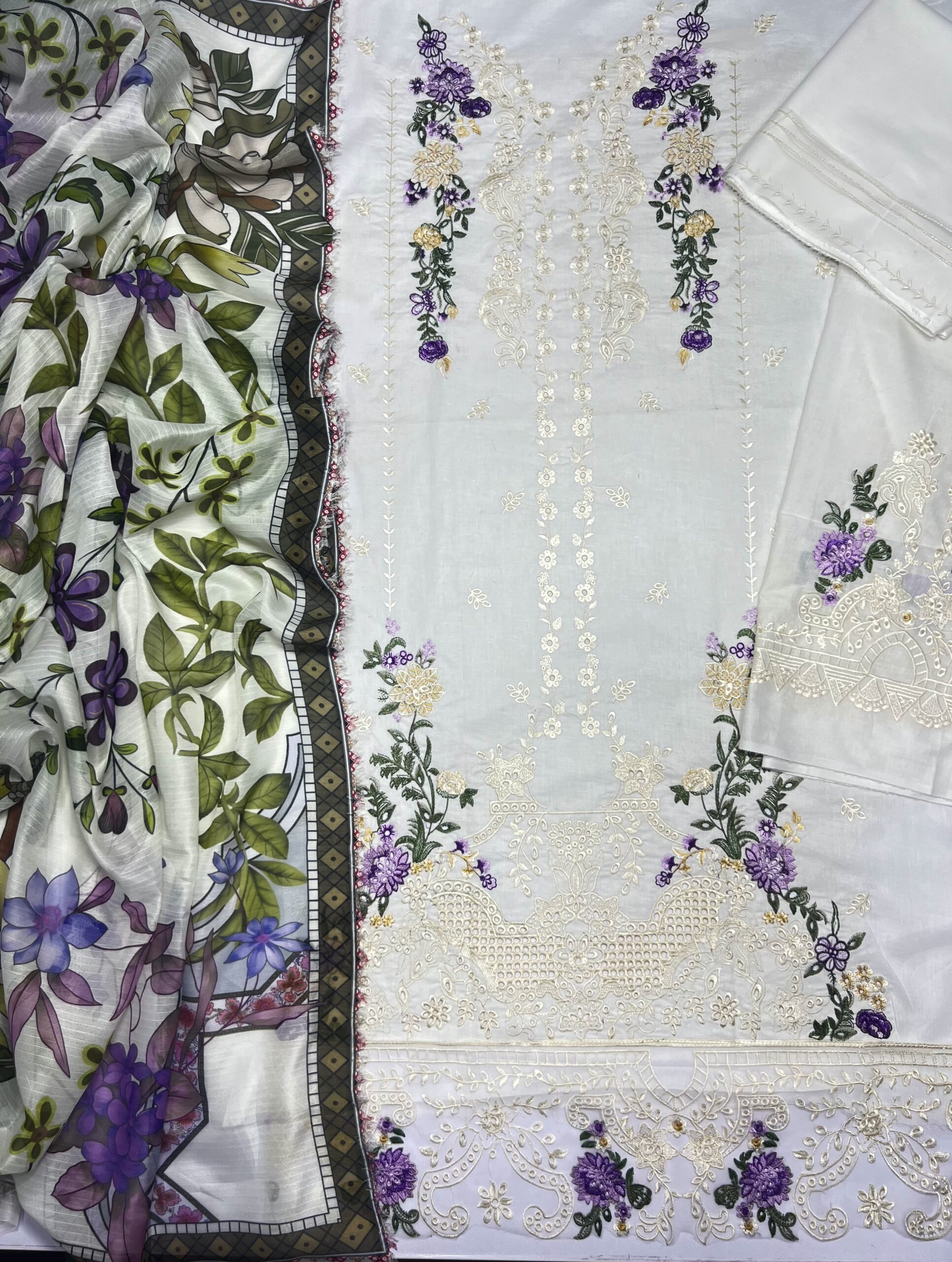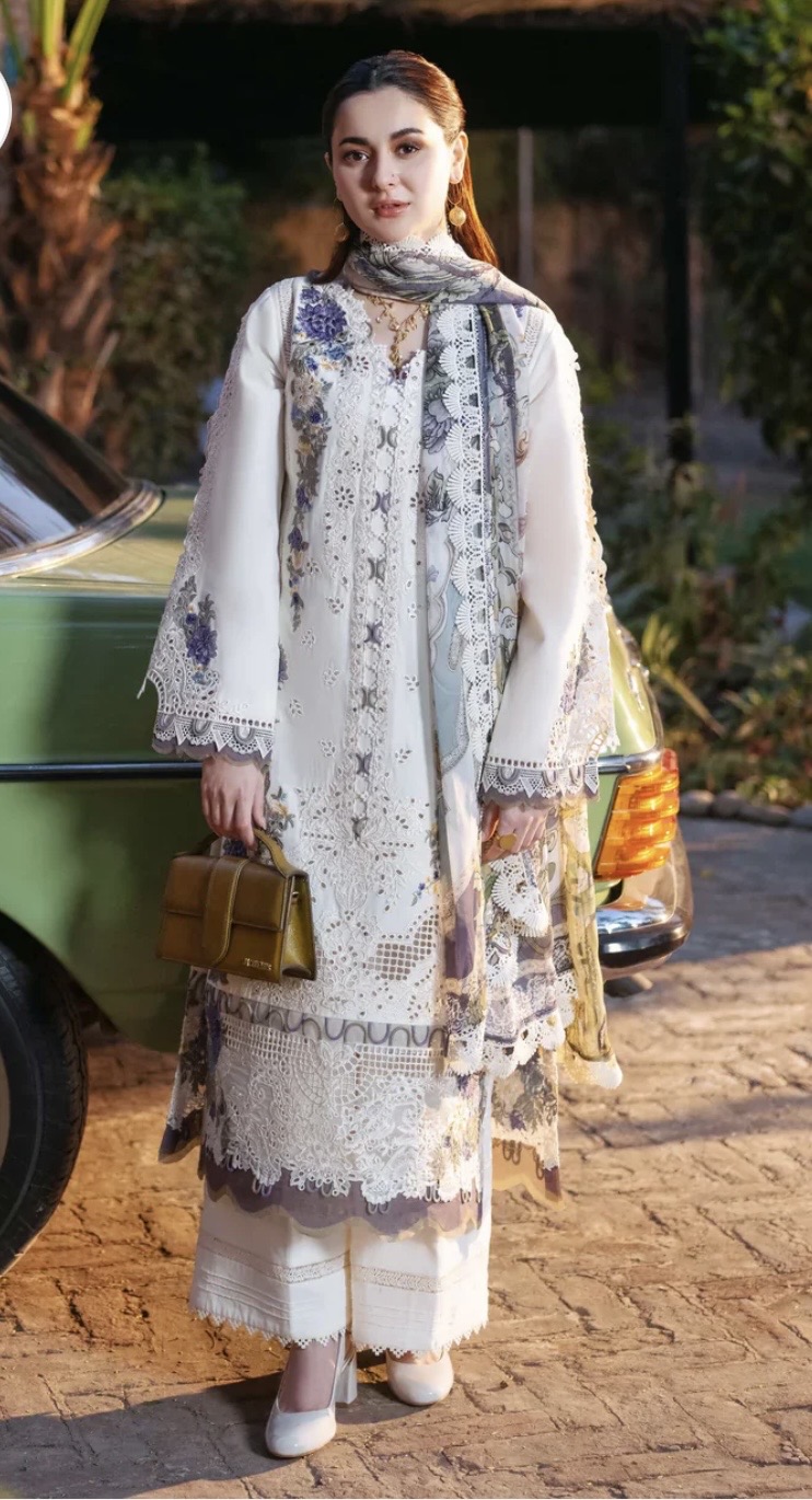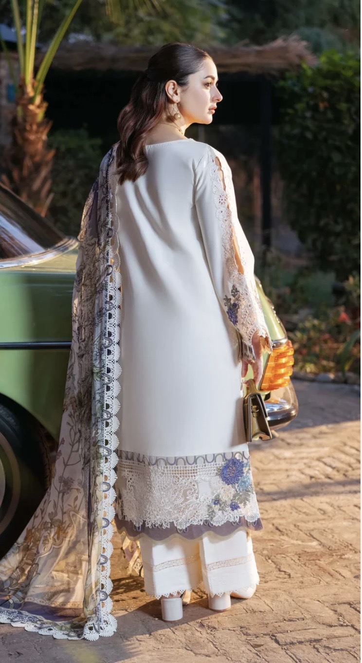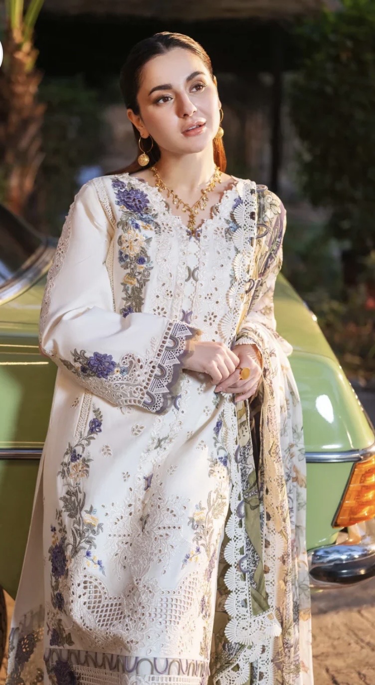 - Is elegant aur luxury suit ka har detail grace aur sophistication ka perfect combination hai. Soft off-white base par ki gayi fine embroidery is outfit ko ek royal touch deti hai, jisme delicate floral patterns aur intricate lace work nazar aata hai. Shirt ke front par heavy embroidered panel aur sleeves par detailed cutwork design iski beauty ko aur enhance karta hai.