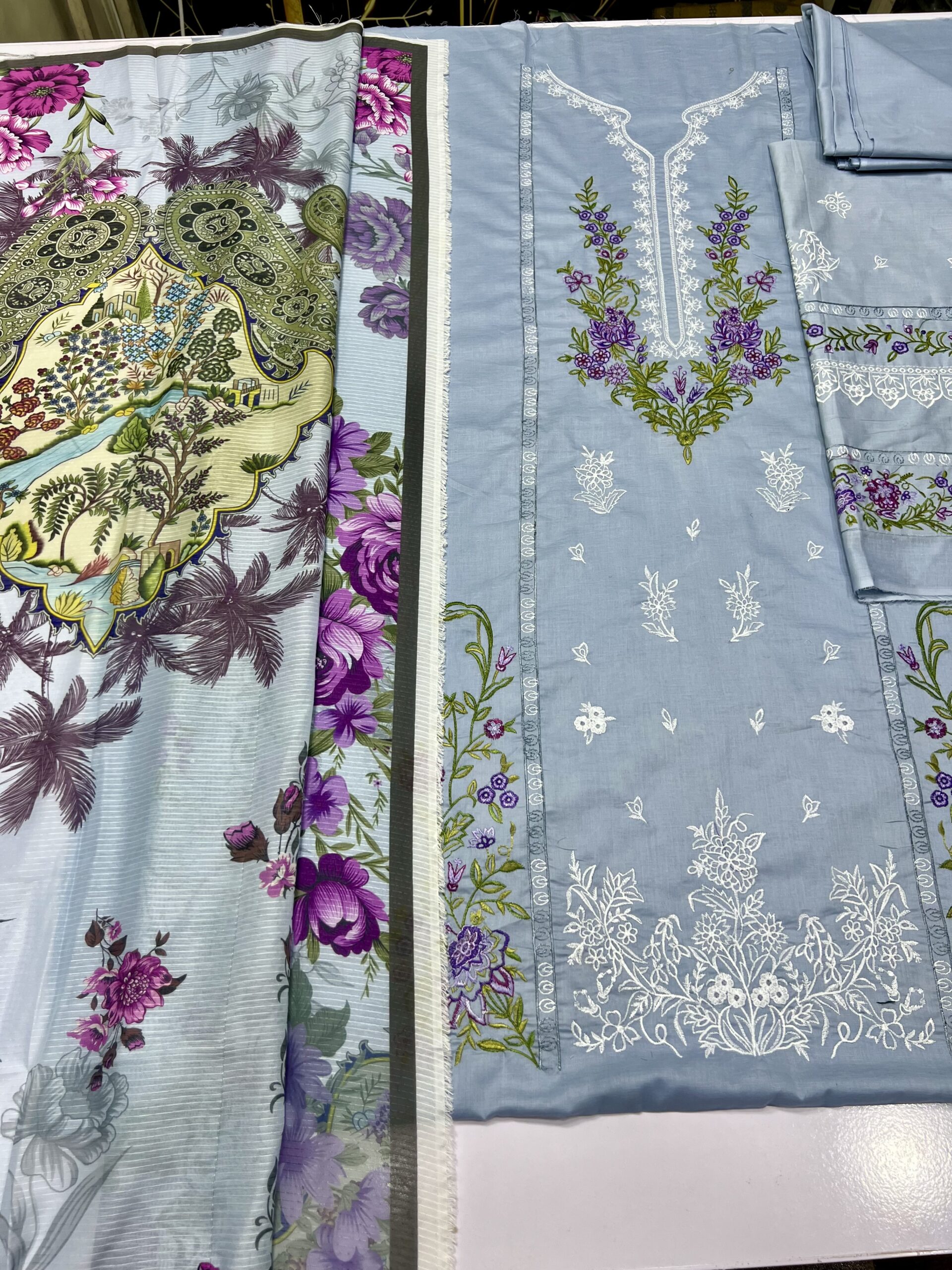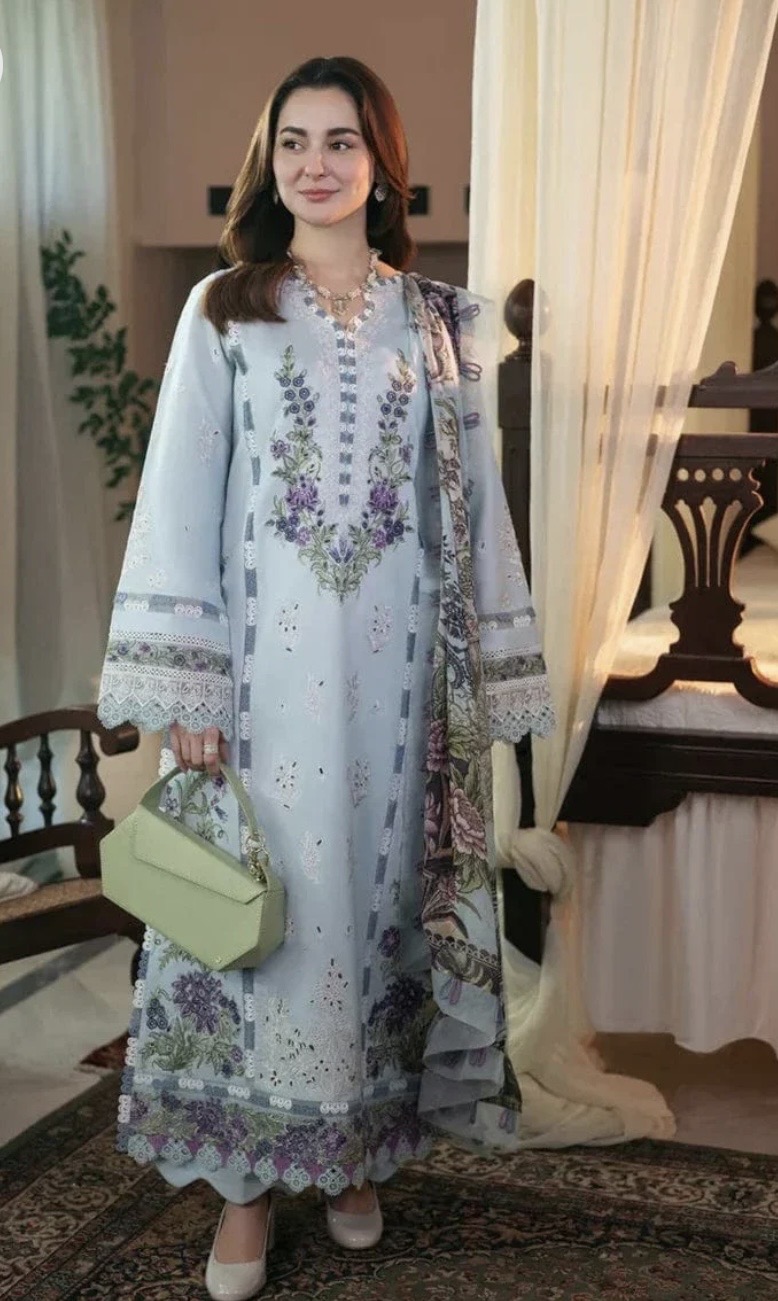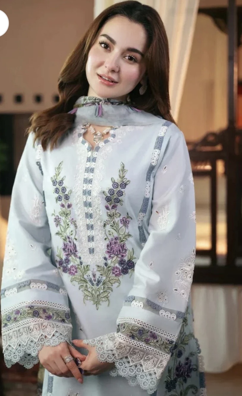 - Yeh bohat hi elegant aur refreshing light grey / steel blue lawn suit hai jo summer wear ke liye perfect choice hai.Is shirt par fine white embroidery ke saath neckline par delicate detailing di gayi hai, jo isay classy aur graceful look deti hai. Front par purple aur green floral embroidery ka beautiful combination hai jo outfit ko fresh aur lively feel deta hai. Shirt ke daman par heavy white embroidered pattern diya gaya hai, jo poore design ko balanced aur premium touch deta hai.