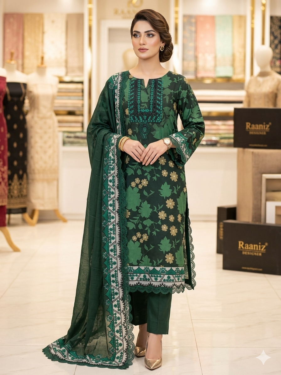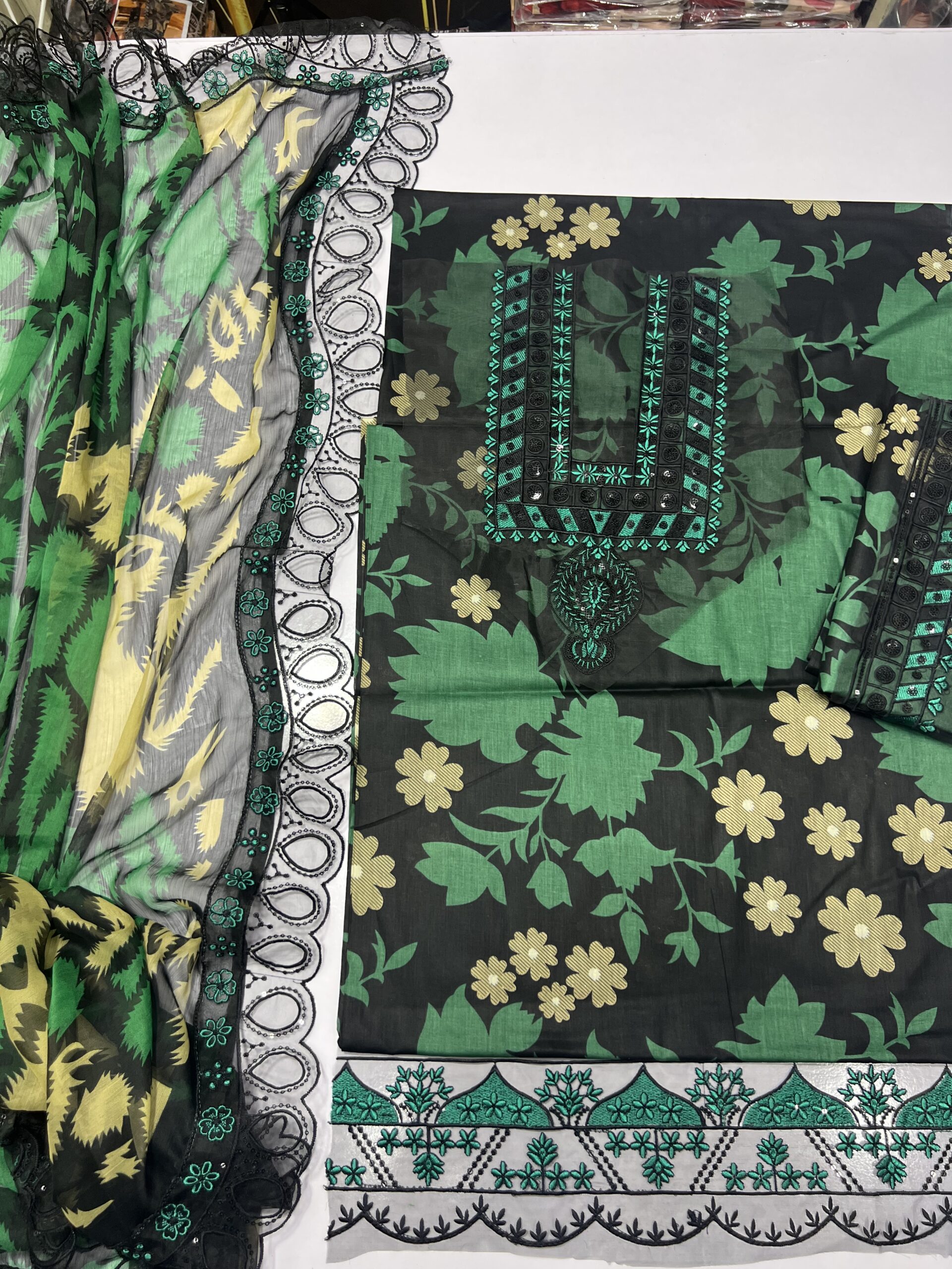 Is ke sath matching trouser bhi hai jo overall look ko perfectly complete karta hai. Dupatta lightweight aur sheer fabric mein hai, jisme green, black aur yellow tones ka stylish print aur embroidered lace border use ki gayi hai — jo is suit ki beauty ko aur enhance karti hai.